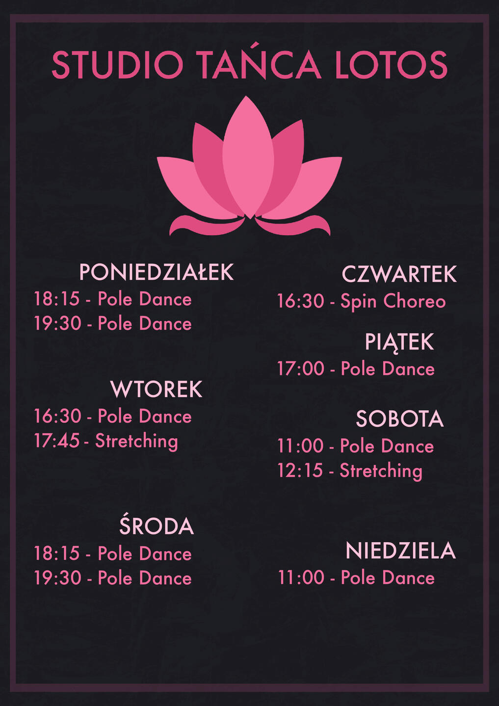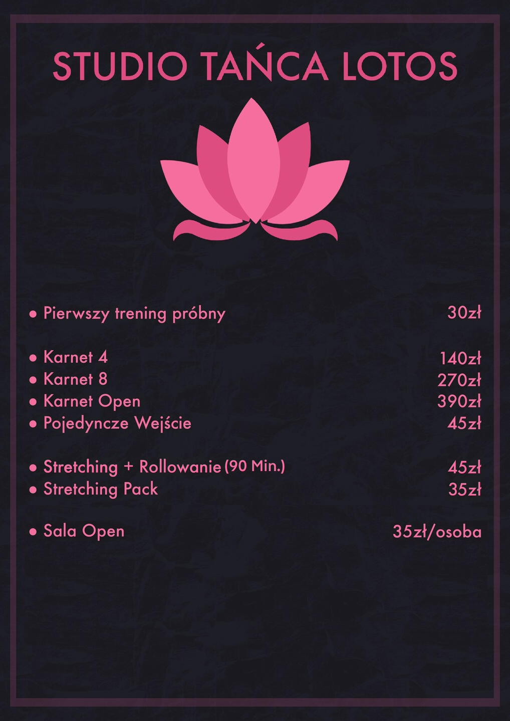 Nasze Studio!Chcesz nauczyć się śmigać na rurce - chodź do nas!Chcesz spędzić czas po pracy czy szkole i przewietrzyć pękającą od obowiązków głowę - do nas!Chcesz poznać nowe osoby i nawiązać świetne przyjaźnie - no pewnie, że do nas!Nie zależy Ci żeby być mistrzem pole dance ale chcesz schudnąć, wzmocnić ciało, poprawić ogólną sprawność - do nas Koleżanko!Chcesz indywidualnego podejścia i czuć się jak na treningu indywidualnym - patrz na odpowiedź wyżej!Co jeszcze potrzebujesz żeby przyjść? Adres? Masz w zakładce KONTAKT.A zatem weź jeszcze tylko dobry humor i wpadaj. A jak nie masz, bez obaw, udostępnimy Ci go na sali!Czekamy!